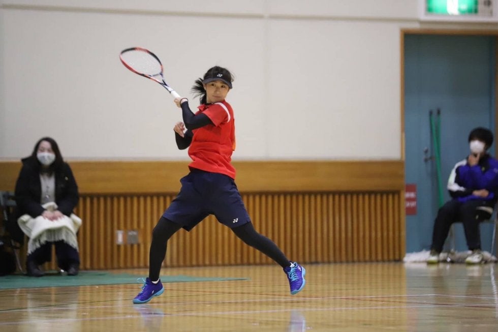 フォアハンドを打つ下江
