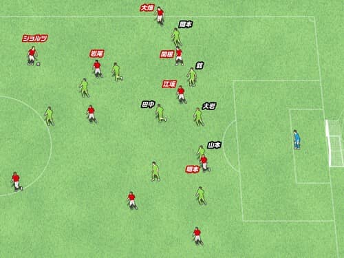 そこへ江坂が走り込み、大畑がプルバックのクロスを通し、先制点となった。