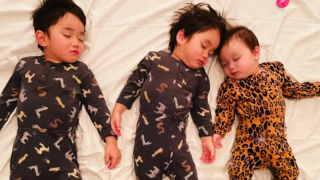 「また同じ姿ですか😅ずーっとバンビーノとべベックがリンクする寝相だったのに3番目のbébéまで同じ姿で寝るようになった😂…