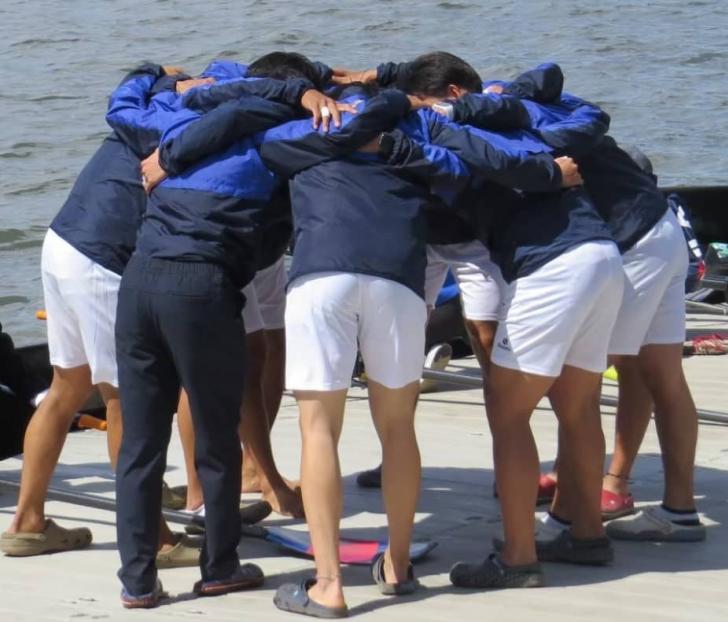 前回大会、レース前に円陣を組んで気合を入れる対校エイトのメンバー