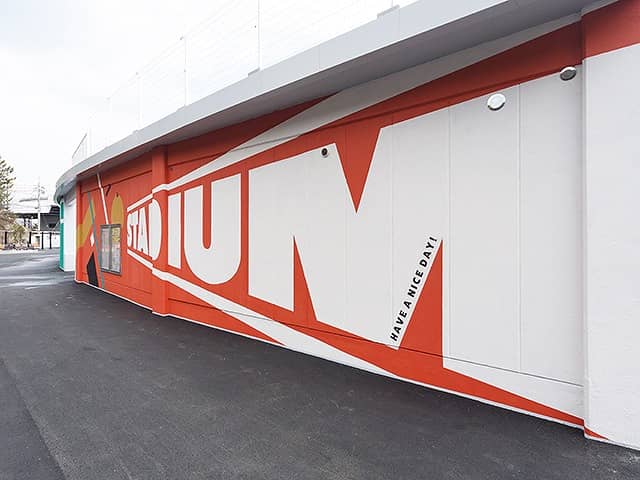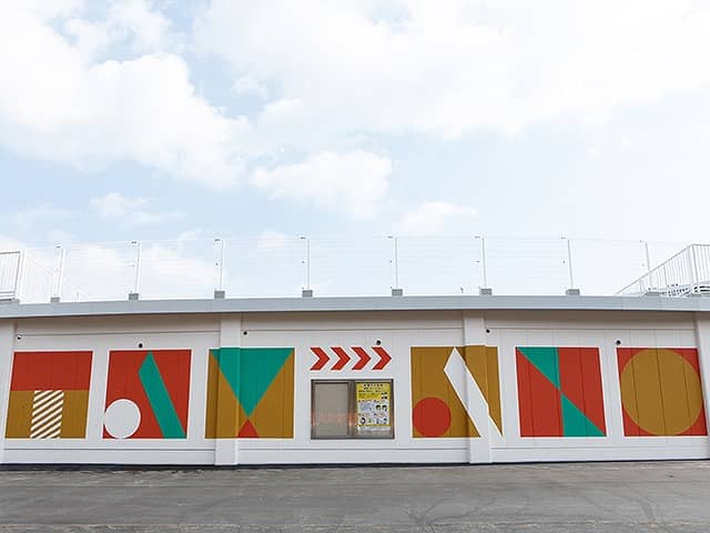 JR宇野駅を下車、駅前から車で約5分で、玉野競輪場のエントランスに到着します。はやる気持ちを抑えて入場ゲートを通ると、新スタンドに続く道には、カラフルで目を引くウォールアートがお出迎え。国内で様々な壁画を手がけるアーティスト集団「RELISH」がデザインしたポップなアートワークは、スタジアムを訪れたお客様に、さらなるワクワク感をもたらします。