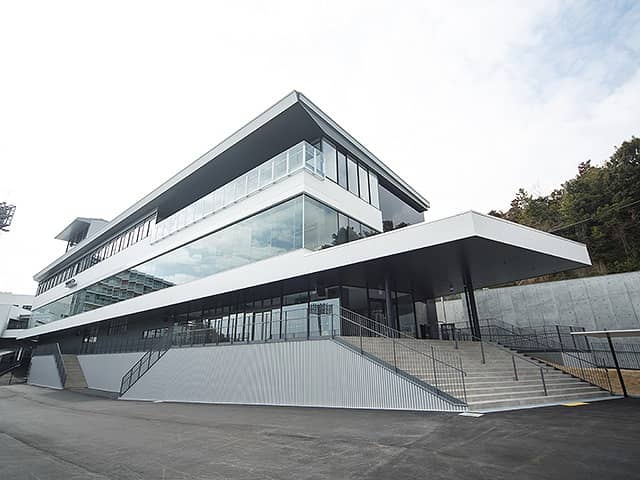 ガラス張りのメインスタンドは全席屋根付きなので、雨の日でも安心!