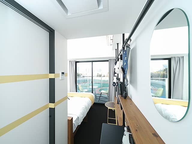高層階の5~8Fにある「オーシャンバンクビュー ツイン・テラス付き」では、ゆったりと過ごせるツインのベッドに、広々としたベランダ付き。玉野競輪は全国の競輪場の中でも、美しいビュースポットとして知られており、部屋から望む瀬戸内海の風景も、大きな魅力のひとつ。
