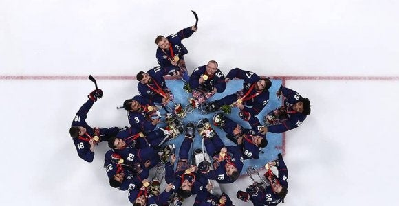 メダルセレモニーで金メダルを受け取り、チームで輪になるアイスホッケー男子米国代表【写真:1384771270,Ryan Pierse,ゲッティイメージズ】