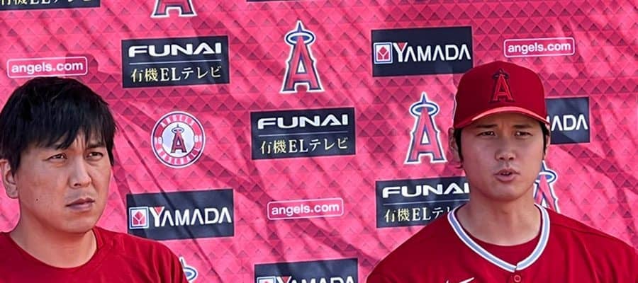会見に臨んだエンゼルス・大谷翔平(右)と水原一平通訳【写真:盆子原浩二】