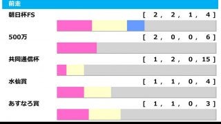 朝日杯フューチュリティS組と並ぶ2勝を挙げているのは500万下組となっているが、2019年夏季競馬よりレース名称が「1勝クラス」に変わってからは一度も馬券内に絡んでいない。次点は共同通信杯、水仙賞、あすなろ賞、若竹賞、白梅賞、ラジオNIKKEI杯(現ホープフルS)が勝利数を分け合っているが前走共同通信杯組は勝率5.6%と絶不調。アサヒとビーアストニッシドの2頭に該当するローテとなるが、特に人気を背負うアサヒにとっては高い壁となりそう。