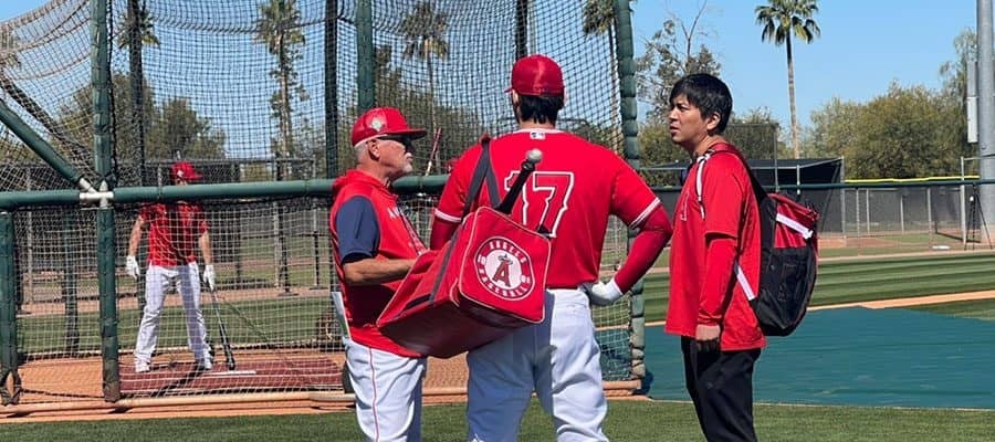 水原通訳と共にマドン監督と話をするエンゼルス・大谷翔平【写真:盆子原浩二】