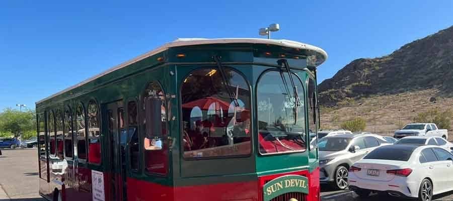 エンゼルスのキャンプ地に登場した赤と深緑で塗装されたシャトルバス【写真:盆子原浩二】