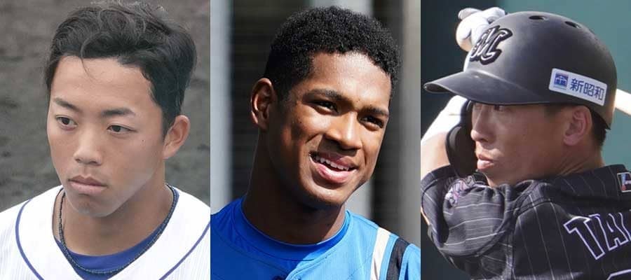 中日・岡林勇希、日本ハム・万波中正、ロッテ・高部瑛斗(左から)【写真:荒川祐史、小西亮】