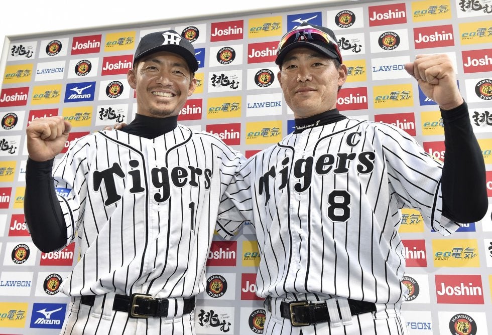 阪神―広島 広島に快勝し5連勝、お立ち台でガッツポーズの阪神・鳥谷(左)と福留=甲子園【写真提供:共同通信社】 ゴールデ…