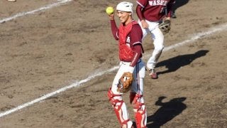 出会い 男子ソフトボール部主将の澤優輝(人=東京・國學院久我山)が早大での4年間でマスクを被った試合は公式戦だけで50試…