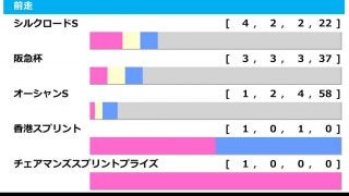 過去10年、最多は前走・シルクロードS組の4勝で【4-2-2-22】の複勝率26.7%と安定した成績を誇る。前走・阪急杯組も【3-3-3-37】で申し分ない成績だが、前走・オーシャンS組は【1-2-4-58】と不振の傾向にある。