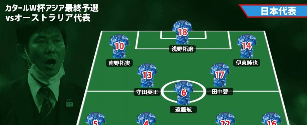 右サイドバックにはDF山根視来(川崎フロンターレ)が入り、CBでDF吉田麻也(サンプドリア)とコンビを組むのはDF板倉滉(シャルケ)に決定。また、1トップにはオーストラリアキラーとも言われるFW浅野拓磨(ボーフム)が起用された。
