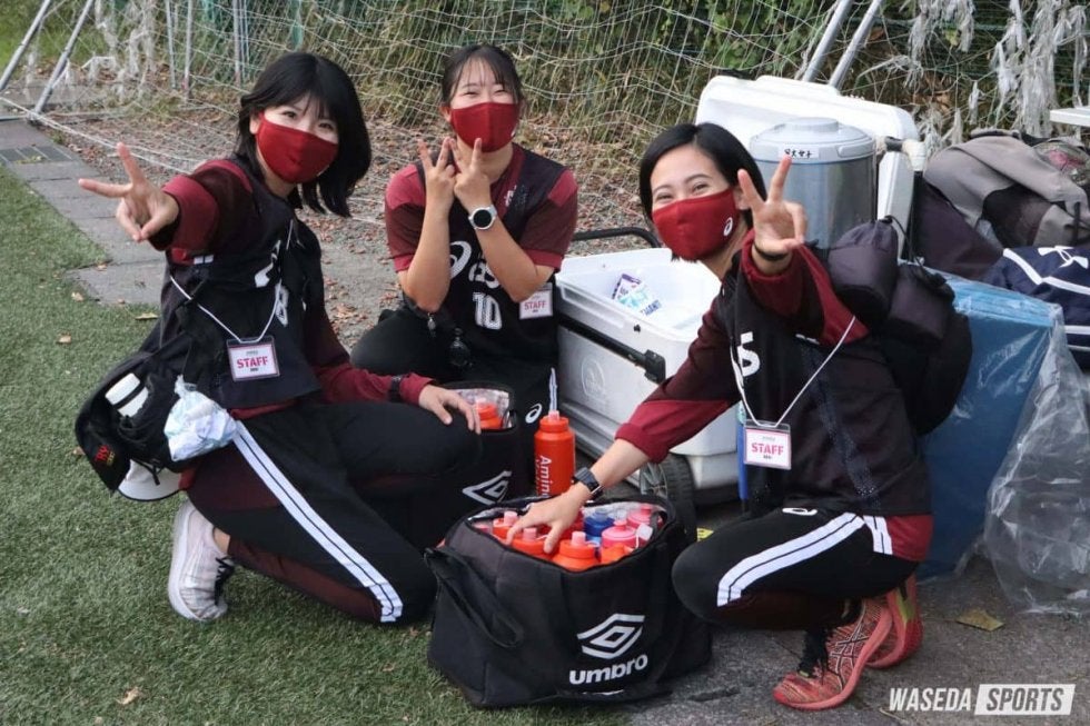 仕事内容がマルチで量も多いのがア女のマネジャーだ。その仕事量に驚かれることも。外部との連絡や遠征の手配、会計などの事務作業はもちろん、練習中のゲームでの副審、動画撮影、水汲みやトレーニングの用具設置など、ピッチ上での役割も多く、挙げだすときりがない。驚くことにミニゲームなどの球出しも山下の担当だ。全くのサッカー未経験者である山下にとって、大学トップレベルの選手たちの要求を満たす球出しは当然ながら容易ではなく、それが一番の苦痛だったという。そして最も多忙だったのは3年生。マネジャーは当時の新入部員、菊池朋香(政経2=早実)と山下のみ。コロナ禍が始まった年でもあり、特に夏は猛暑のなかマスク・手袋を付けてピッチ中を駆け回った。