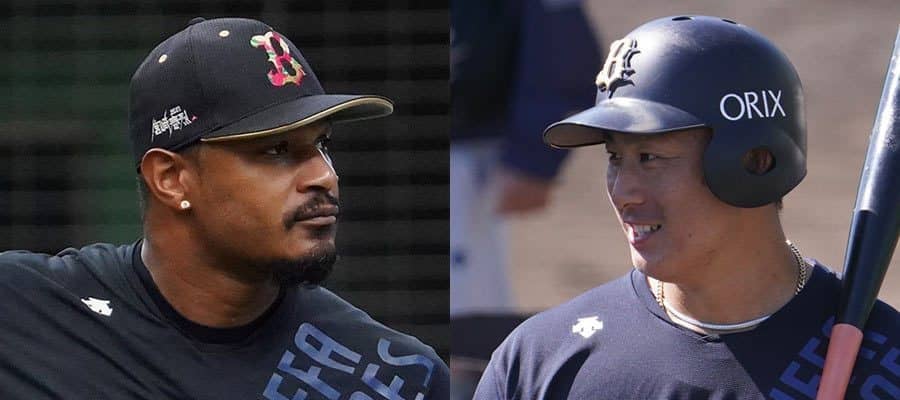 昨季までオリックスに在籍したアダム・ジョーンズ(左)と杉本裕太郎【写真:荒川祐史】