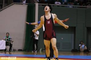 2019年のインカレ、フリースタイル65級で2連覇を決めガッツポーズする安楽