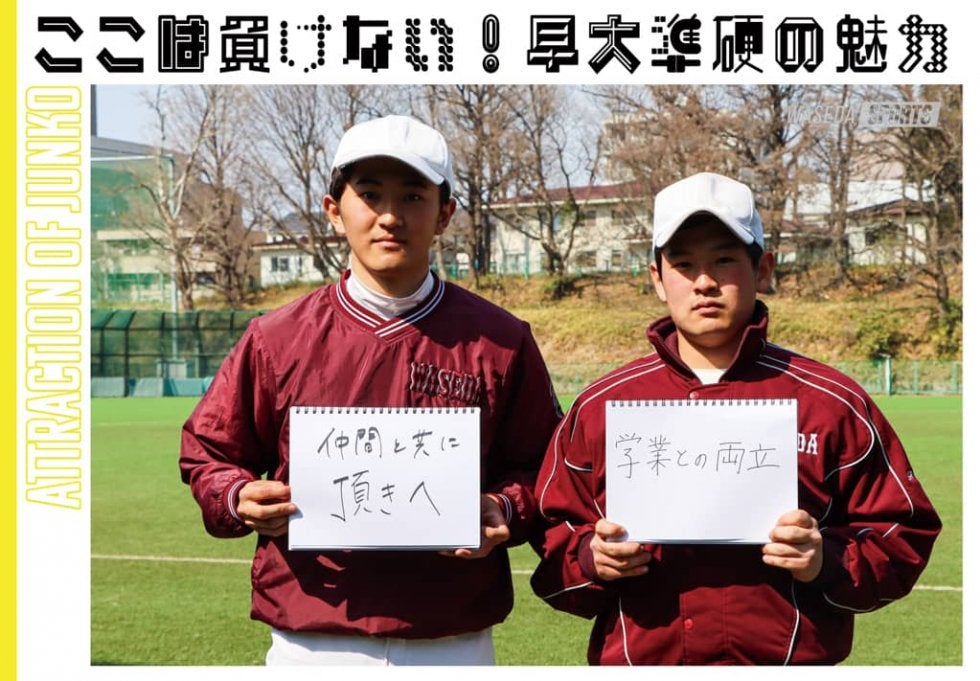 第1回では、軟式野球部出身の納谷健蔵選手(商2=茨城・土浦日大)、藤澤佑成(社2=東京・早実)にお話を伺いました! 準硬式野球は硬式野球と軟式野球のハイブリッドであり、早大準硬でも軟式野球出身者が活躍しています。軟式野球部出身者から見た、準硬式野球の魅力とは――。