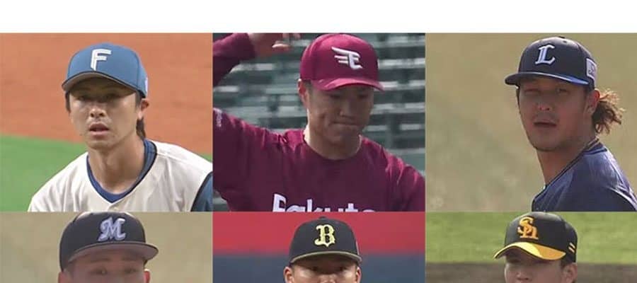 日本ハム・上沢直之、楽天・則本昂大、西武・高橋光成、ソフトバンク・千賀滉大、オリックス・山本由伸、ロッテ・小島和哉(左上から時計回り)【画像:パーソル パ・リーグTV】