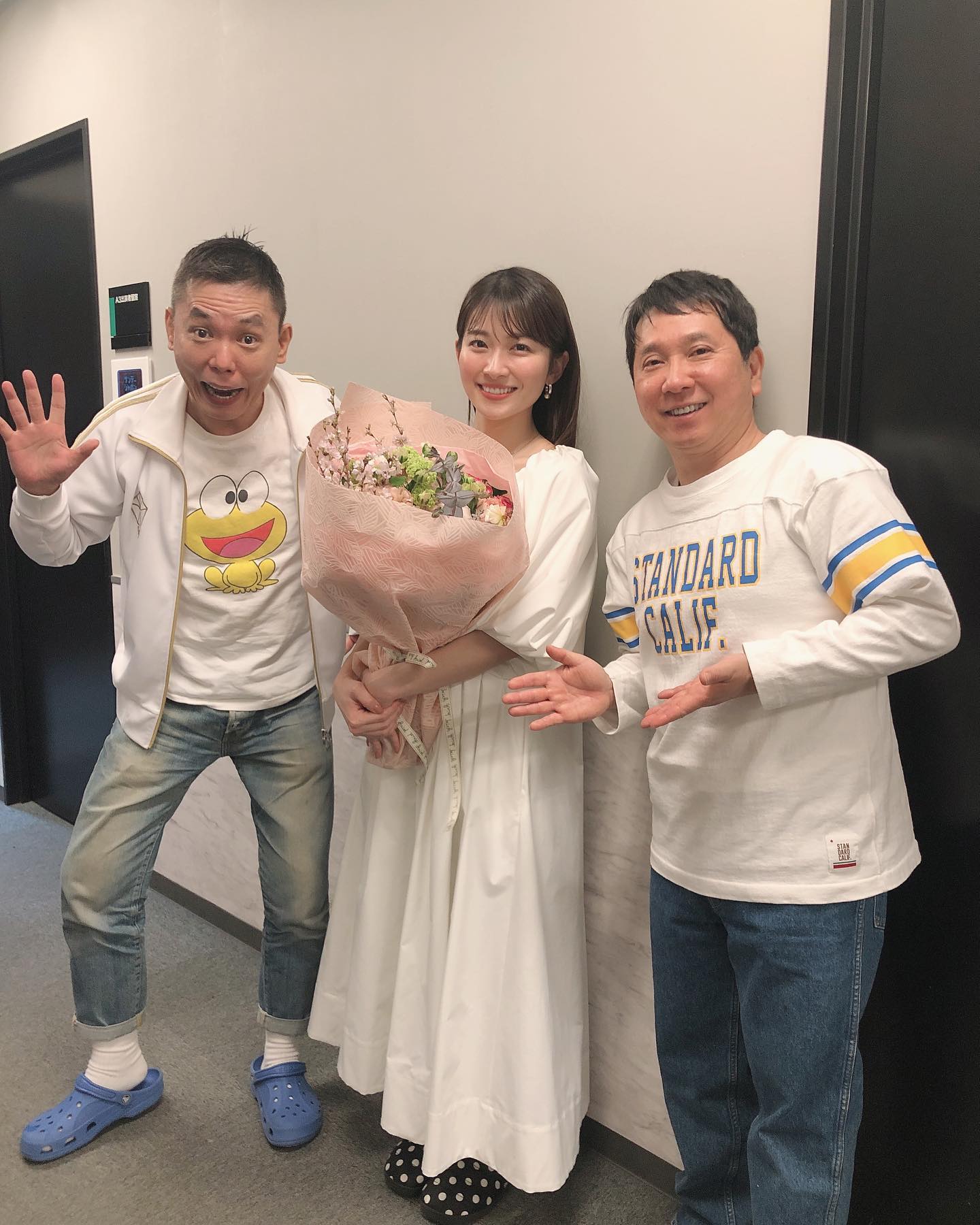 「そして4年3ヶ月担当したサンデージャポンを卒業しました」と綴り、2枚の写真をアップ。MCである爆笑問題さんとの3ショットを公開した。