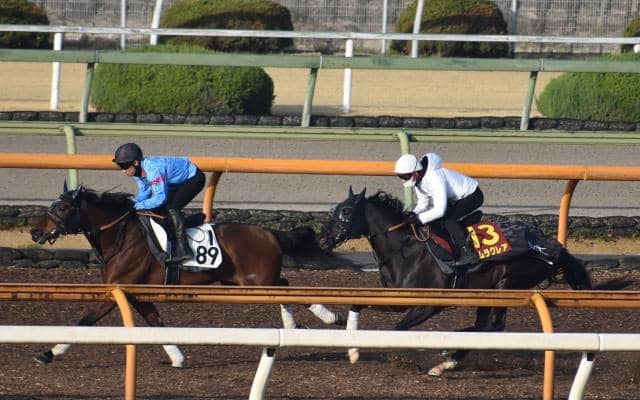 桜花賞1週間前追い切りで素晴らしい動きを見せるナムラクレア(写真右、撮影:井内利彰)