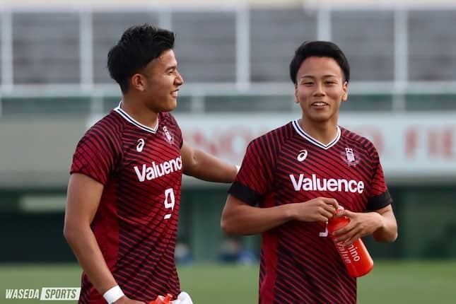 駒沢 僕は陽琉くんの破壊力やパワー、それからボールを収める能力がほんとにすごいなと思っています。収める選手って意外と収めるだけになりがちなんですが、陽琉くんの場合は違っていて、例えばボールを収めてからサイドハーフにつけるパスで、僕だったら自分は収める仕事は終わったから、サイドハーフの足元にパスをつけるんですけど、陽琉くんは足元じゃなくて裏に出したりするんですよ。それはいつもすごいなと思っていて、自分も真似したいなと思うポイントです。今早稲田はワントップなんですが、いつか僕と陽琉くんでツートップを組んで、僕が裏に抜けて陽琉くんが下で収めて、みたいなことをやりたいなと思っています。