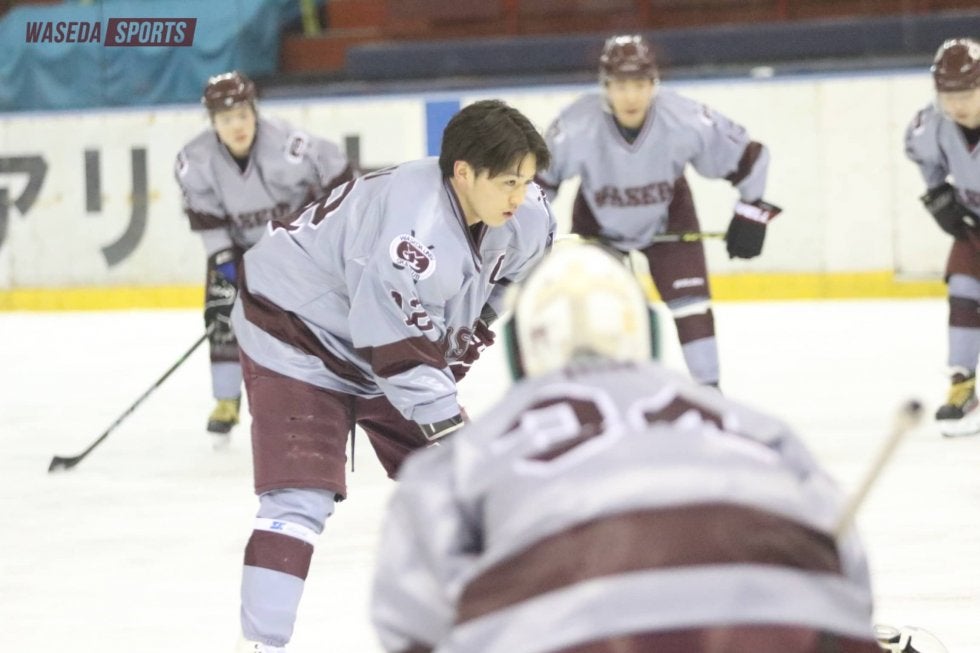 第1ピリオド(P)、最初に得点を決めたのは法大だった。開始4分、ペナルティーによってPK(※1)になった早大は、パックをなかなかディフェンスゾーンから出すことができない。ゴールの右側から角度のないシュートを決められ、先制を許してしまった。その後、2度のPP(※2)のチャンスが生まれるも、攻撃のかたちを保てず、無得点で第2Pに移る。