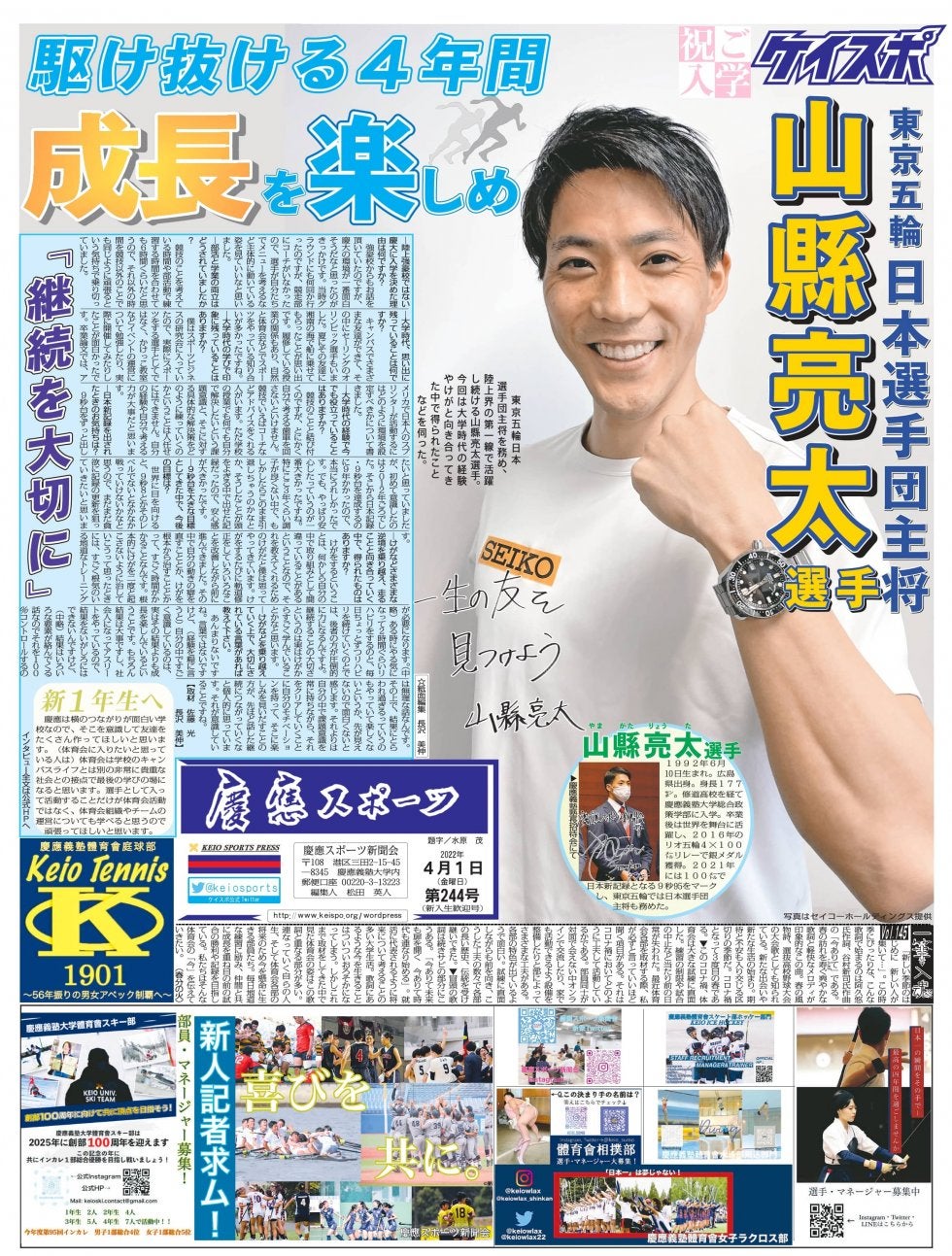 1面毎年新歓号の1面は慶大出身の有名人に取材を受けていただいています。今年は、東京オリンピックで日本選手団主将を務められ、陸上界の第一線で活躍し続ける山縣亮太選手に1面を飾っていただきました。