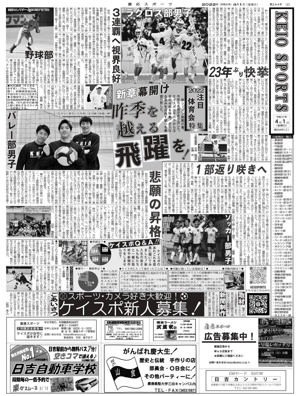 2面2面では昨年素晴らしい活躍をみせたラクロス部、野球部、サッカー部、バレー部の4部を取り上げています!チームを引っ張る注目選手を取材し今年のチームを徹底分析しました。今年は有観客の試合が増えることも期待できるので2面を読んで試合の応援に行けば楽しめること間違いなしです!今年も彼らの活躍には目が離せません!