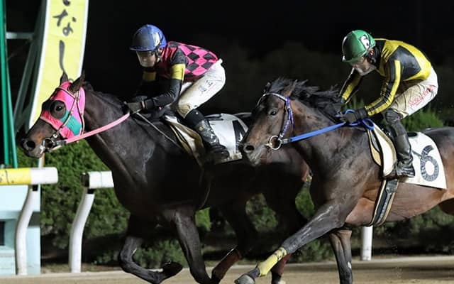 2日の佐賀8R・テイエムキセキダン(写真左)で初勝利をあげた中山騎手(提供:佐賀県競馬組合)