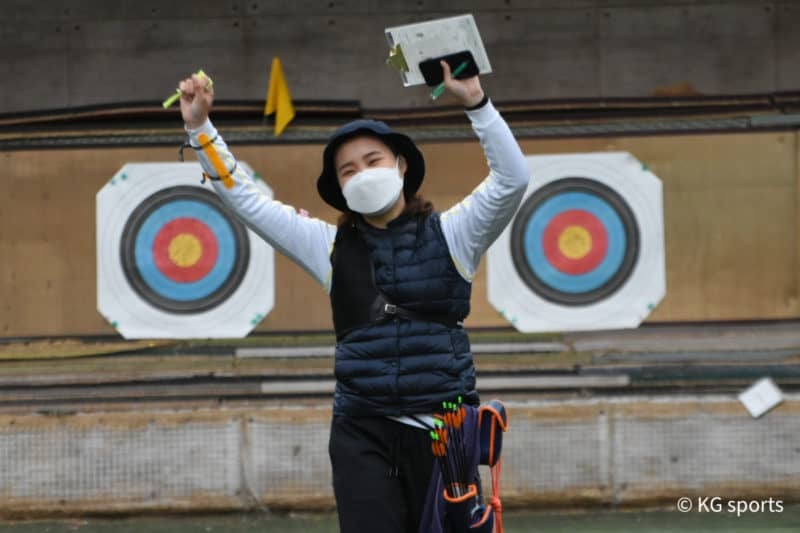 <写真・120金を記録し、喜ぶ梅本>4月3日、関西学院大学上ヶ原レンジにて第57回関西学生アーチェリーリーグ戦第1戦が行…