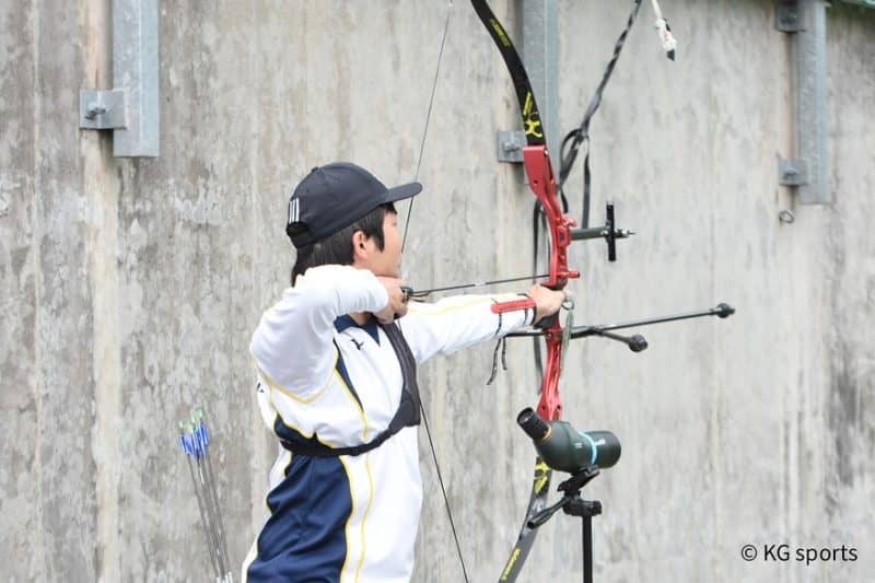 <写真・行射する松田主将>4月3日、関西学院大学上ヶ原レンジにて第62回関西学生アーチェリーリーグ戦第1戦が行われ、関学…