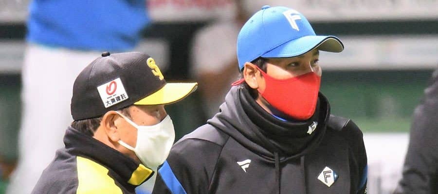 日本ハム・新庄監督(右)とソフトバンク・藤本博史監督【写真:藤浦一都】