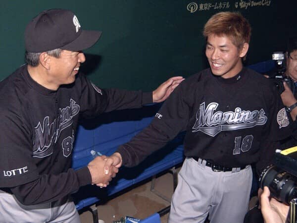 2002年、勝利投手になった清水(右)を笑顔で迎える山本功児監督