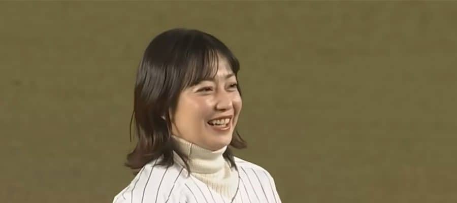 スカートひらり… 女優・大政絢さんが豪快投球でファン魅了「可愛すぎて」