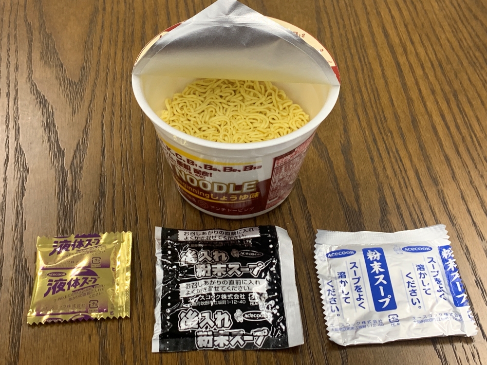 粉末スープ2つ(先入れ、後入れ)と液体スープ1つ(後入れ)が同梱