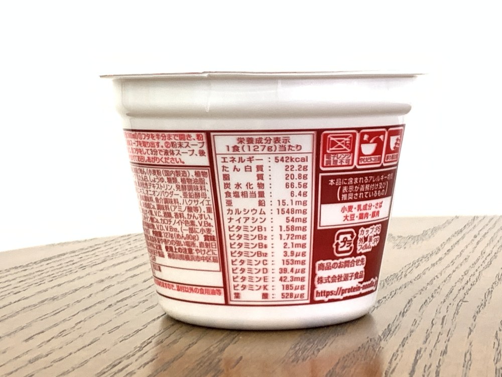 The Beginningしょうゆ味カップヌードルPRO内容量127g(めん90g)74g(めん60g)カロリー542kcal274kcalたんぱく質22.2g15.2g脂質20.8g16.8g炭水化物66.5g35.4g食塩相当量6.4g4.8g亜鉛15.1mg記載なしカルシウム1548mg105mgナイアシン54mg記載なしビタミンB11.58mg0.22mgビタミンB21.72mg0.40mgビタミンB62.1mg記載なしビタミンB123.9μg記載なしビタミンC153mg記載なしビタミンD39.4μg記載なしビタミンE42.3mg記載なしビタミンK185μg記載なし葉酸528μg記載なし