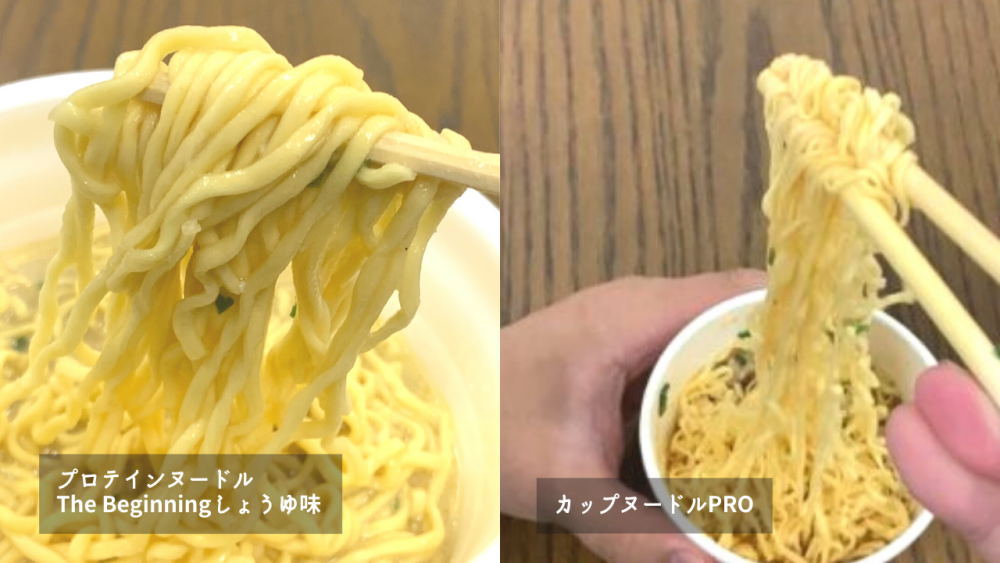 「プロテインヌードルThe Beginningしょうゆ味」と日清食品「カップヌードルPRO」を比較