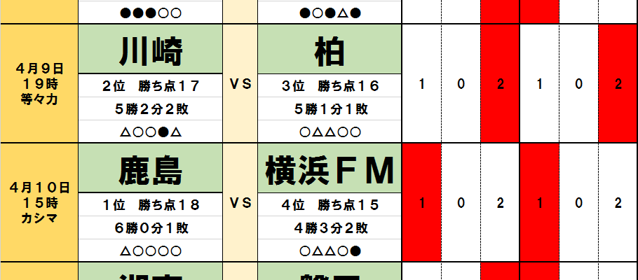 今回のtotoではJ1第8節の9試合とJ2第9節の4試合が対象となっている。過去のデータや直近の様子などから、分析を進…