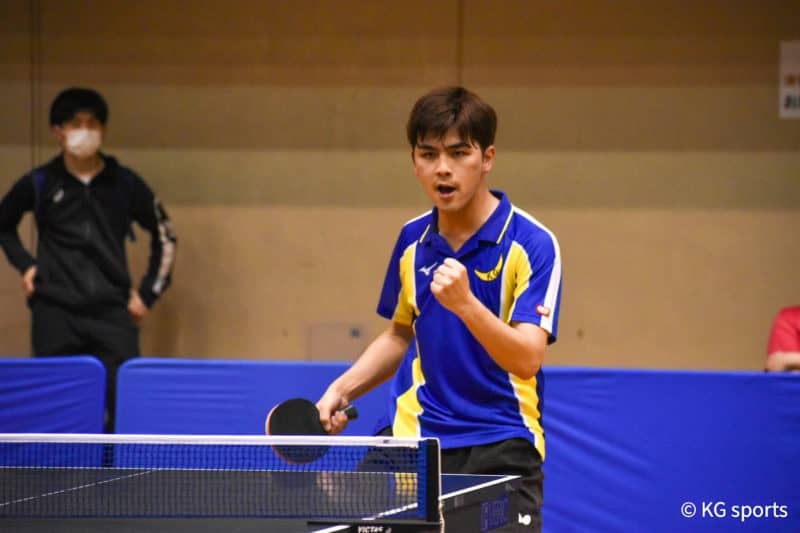 <写真・得点を決めガッツポーズをする谷山> 4月9日、京都市横大路運動公園体育館にて第64回関西学生卓球新人大会1日目が…
