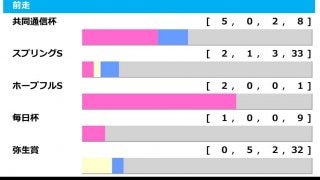 共同通信杯 【5-0-2-8】 勝率33.3%、連対率33.3%、複勝率46.7% スプリングS 【2-1-3-33】 勝率5.1%、連対率7.7%、複勝率15.4% ホープフルS 【2-0-0-1】 勝率66.7%、連対率66.7%、複勝率66.7% 毎日杯 【1-0-0-9】 勝率10.0%、連対率10.0%、複勝率10.0%