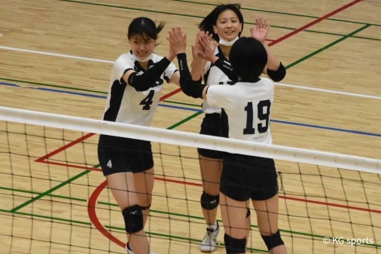 <写真・ハイタッチする選手たち>4月17日、2022年度関西大学バレーボール連盟春季リーグ第4戦が行われ、関学は大体大と…