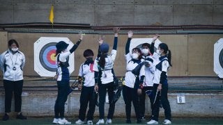 <写真・円陣を組み掛け声を出す選手たち> 4月17日、関西学院大学上ヶ原レンジにて第57回関西学生アーチェリーリーグ戦第…