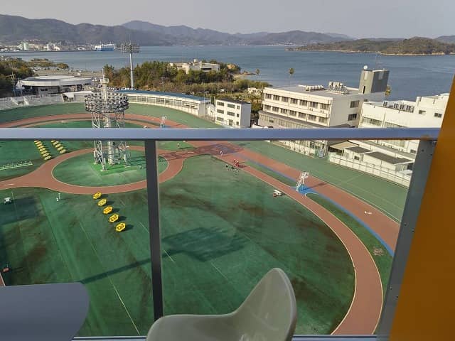 カーテンを開けると、目の前には瀬戸内海、そして真下にはバンク! 思わず「ビューティフォー!」と、英検3級の力でも一言で表せる景色! テンション爆上がりのまま、テラスのベンチヘ。心地よい春の潮風に打たれ、玉野記念前日練習に励む選手を見ながら、明日から始まる激戦に胸が躍る! この距離、この角度で競輪が楽しめるのか! まさにVIPオブVIP!