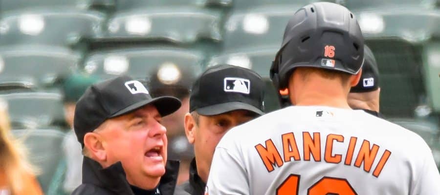 一塁審判に抗議するオリオールズのトレイ・マンシーニ(右)【写真:Getty Images】