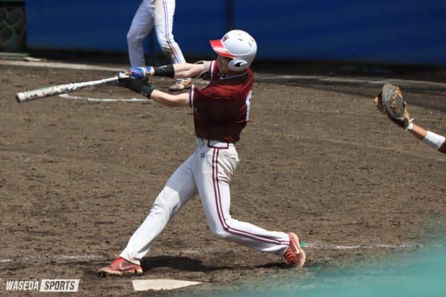 初回、先頭の鈴木が四球で出塁すると、続く安孫子が安打で続く。1死後、自身初の4番に座った齋藤の犠飛で鈴木がホームを踏むと、5番・畠山が左中間を破る三塁打を放ち、安孫子が生還。早大は幸先よく2点を先制する。続く2回には駒谷理央(国教4=米国・バッファローグローブ)と稲井宏平(法3=埼玉・早大本庄)の四球で1死一、二塁の好機を作ると、鈴木のあわや本塁打という大飛球が適時二塁打となり1点を追加した。
