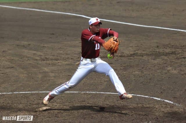 先発の佐藤慶は初回に失策と安打で1死一、二塁のピンチを背負うも、連続三振で切り抜ける。その後は二塁を踏ませない快投で3回を無失点で抑えた。続くマウンドに上がった稲垣は5回に三者連続三振を奪うなど、被安打0、7奪三振の完璧な投球。早大が誇る二枚看板が盤石の完封リレーを見せた。