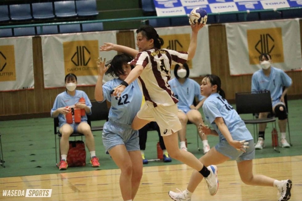 早大は序盤、守備からリズムを作り2点を先行することに成功する。その後も木村百花(スポ2=東京・白梅学園)のサイドシュートや村上楓(スポ3=福岡・明光学園)のロングシュートを中心に得点を積み重ね、リードを保ちながら試合を進めていく。しかし相手は前リーグで全勝優勝を成し遂げたチーム、簡単にはいかない。前半中盤以降は相手の猛攻に遭い、徐々に差を詰められていく。さらに早大もオフェンスでミスを重ねたこともあり一時は逆転を許す。しかしここで引き離されなかったのがこの試合の早大、前半終盤には浦野詩織(スポ3=愛知・旭丘)、木村の連続得点で追いつき、前半は12-12の同点で折り返す。