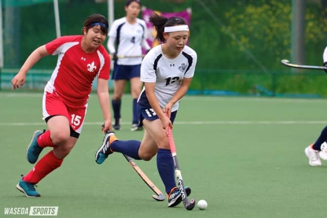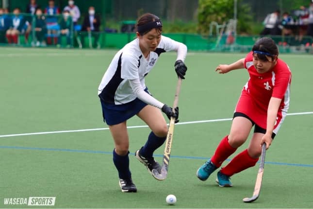 試合は前節同様、開始直後から早大がボールを握り相手を押し込む展開だった。1分には、FW鈴木千心(社3=東京・東学大付国際中教校)の仕掛けから、早くもこの日初のPC(ペナルティコーナー)を獲得。惜しくもゴールとはならなかったが、相手の出鼻をくじくには十分の攻撃であった。勢いを緩めない早大は、7分に再びPCを得ると、今度はこれを山下がきっちりと沈め1―0。待望の先制点が生まれる。得点を重ねたい早大だったが、そのまま第1Qは終了。続く第2Qは相手の堅い守備に焦りを感じたか、パス回しのミスからカウンターを受けるシーンも。結局第2Qは無得点に終わり、前半を1点リードのままで折り返した。