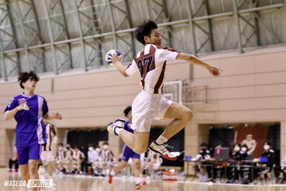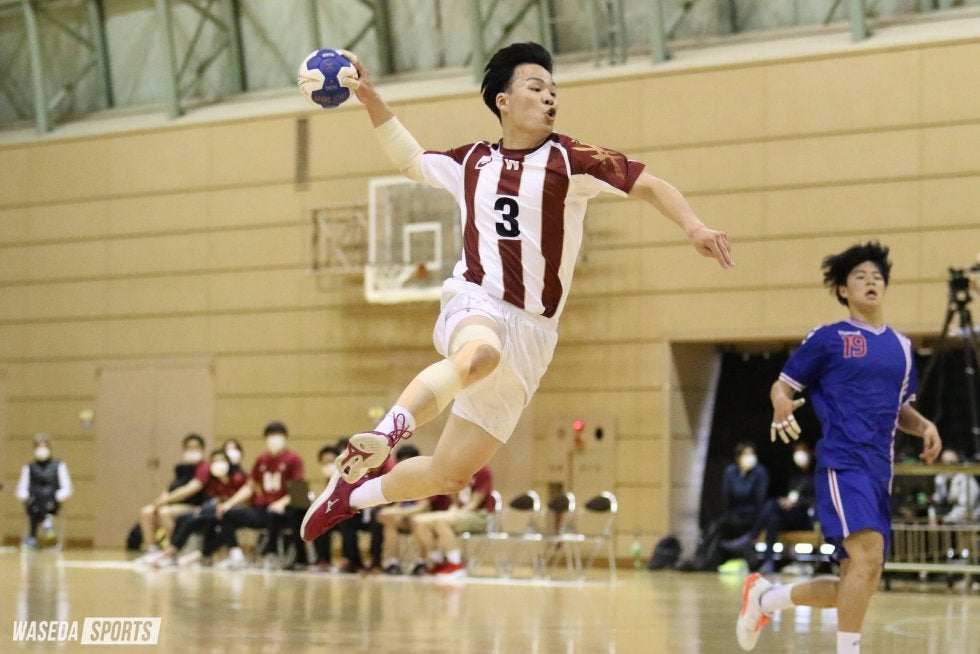 「勝因は1年生」と永橋優太朗主将(スポ4=千葉・市川)が振り返ったように、1年生の活躍が勝利を手繰り寄せた。試合開始直後から、早大のアグレッシブなディフェンスが見られた。攻撃では永橋主将のシュートを皮切りに5連続得点をあげ、理想的なスタートを切る。そして前半18分、1年生の外種子田崚汰(スポ1=鹿児島・国分)が速攻から公式戦初得点をあげ、続けて見事なループシュートを決めると早大ベンチはひときわ大きな盛り上がりを見せた。相手の攻撃も徐々に機能し始める中、1年生がチームに勢いをもたらし11-9で前半を折り返した。