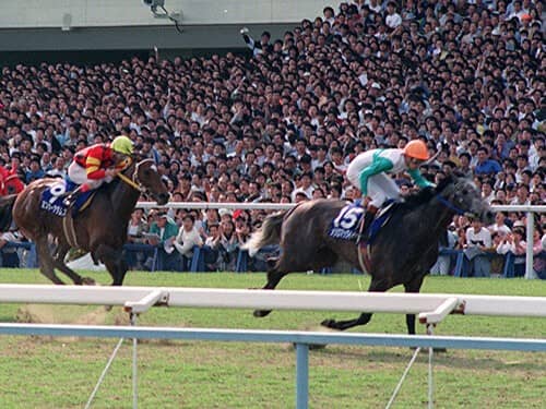 ライスシャワーも、長距離にめっぽう強いステイヤー。レースではマックイーンの背後をマークし、芦毛の馬体が抜け出したところを交わしたのである。マックイーンの3連覇は夢に終わったが、名ステイヤー2頭によるすばらしいレースだった。